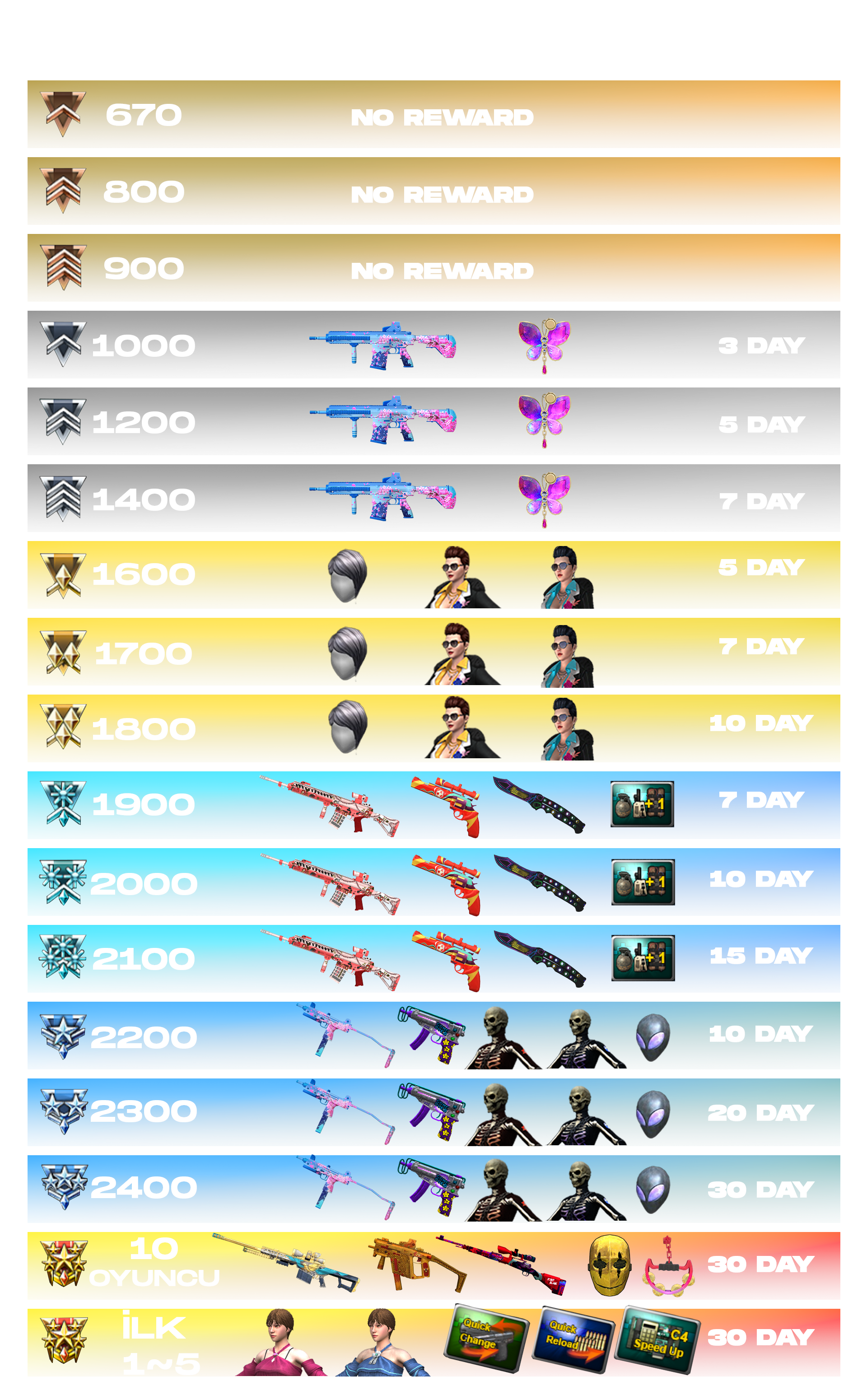 Shotguns, health-damaging smoke grenades, grenade launchers, APC9, Compound Bow, CrossBow, Barrett M82A1, Extra Grenade Pocket +1, wigs that grant both HP and Speed bonuses, instant-exploding grenades, and 140 HP characters.