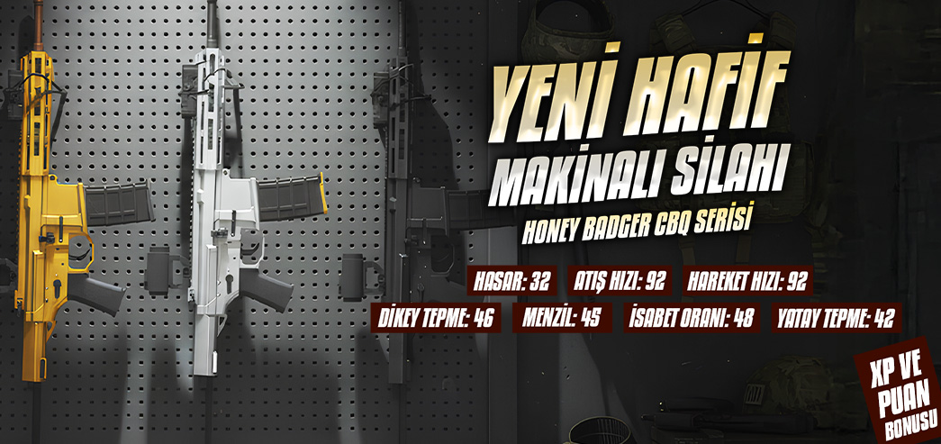Honey Badger CQB Silver kullandığınız sürece +%100 XP ve +%100 Puan bonusu