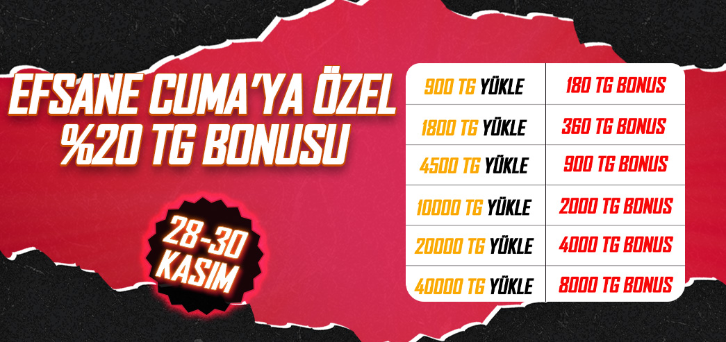 20.000 TG yükleyen oyuncuya 4.000 TG bonus, toplamda 24.000 TG verilir.