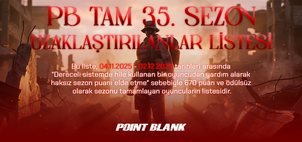 PB TAM 35. Sezon boyunca hile kullananları tespit etme çabalarından dolayı Moderatör arkadaşlarımıza ve siz değerli oyuncularımıza teşekkür ederiz.