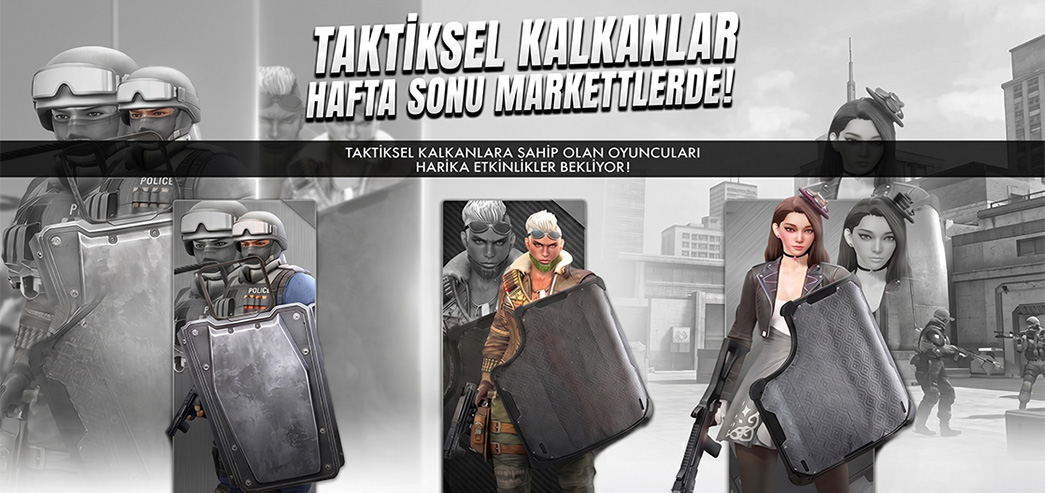 Savaş alanında üstünlük kurmanızı sağlayacak Taktiksel Kalkan G36C, Taktiksel Kalkan Spectre ve Taktiksel Kalkan Tec-9 tekli satışlarıyla 17 Nisan'dan itibaren doğrudan oyun içi mağazada ve TAM Store'da sizlerle buluşuyor. Kalkanları dilerseniz 1 günlük, 7 günlük veya 30 günlük seçeneklerle satın alabilirsiniz.