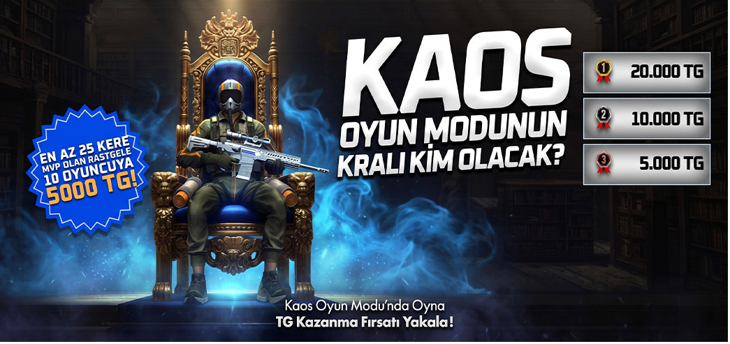 Haftalık TG ödüllerimiz başlıyor! Oyun alanında yeteneklerini konuşturup takımını sırtlayan en iyi oyuncularımızı muhteşem ödüller bekliyor. Kaos Modu'nda hünerlerini sergile, en çok MVP olan ilk 3 oyuncudan biri ol veya şanslı ödül havuzuna girmeye hak kazan!