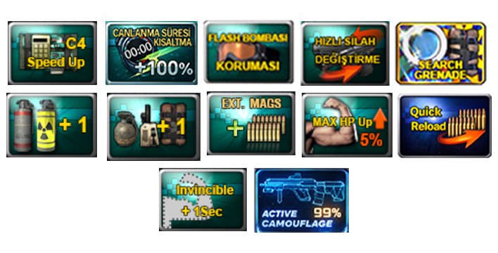 Only users who own the Season Pass Premium can purchase this item. 30 Day C4 Speed Kit Grenade Slot +1 Quick Respawn 100% Anti Flash Bang Mask Quick Change Weapon Special weapon slot add Increase Invincible Time Ammo Up Quick Change Magazine Explosive Search Kit Active Camouflage 99% Mega HP %5 |